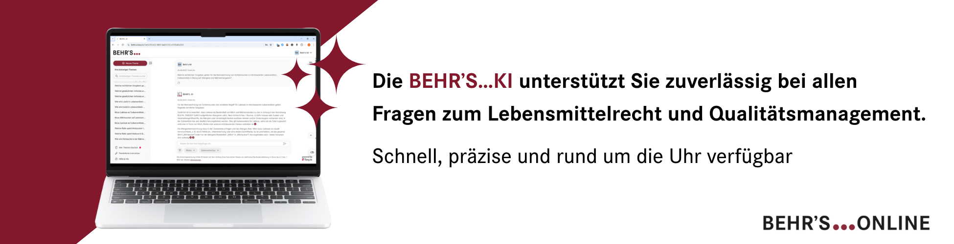 Optimieren Sie Ihre Recherche mit der BEHR‘S…KI: Die in den Paketen Lebensmittelrecht Basis, Professionell und Professionell PLUS sowie Qualitätsmanagement Basis, Professionell und Professionell PLUS enthaltene BEHR‘S…KI unterstützt Sie dabei, schneller relevante Informationen zu lebensmittelrechtlichen Fragestellungen und Herausforderungen im Qualitätsmanagement zu finden. Anstatt lange zu suchen, erhalten Sie strukturierte Hinweise, die Sie bei Ihrer eigenen Recherchearbeit begleiten – jederzeit und auf übersichtliche Weise.