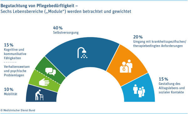 Bernhard Fleer: Die Gutachterinnen und Gutachter des Medizinischen Dienstes prüfen, welchen Pflege- und Unterstützungsbedarf die antragstellende Person in insgesamt sechs Lebensbereichen (sogenannten Modulen) hat. Für jedes Modul werden Punkte vergeben: je höher der Unterstützungsbedarf, desto mehr Punkte. Die Punkte fließen mit unterschiedlicher Gewichtung in die Gesamtwertung ein. Die Summe der gewichteten Punkte aller Module ergibt den Gesamtpunktwert aus dem sich der Pflegegrad bestimmt. Die Angehörigen sollten sich die Frage stellen: Was kann eine Person allein und wobei braucht sie Unterstützung? Für den Pflegegrad zählt, welche personelle Unterstützung in den Modulen nötig ist.